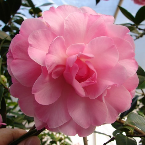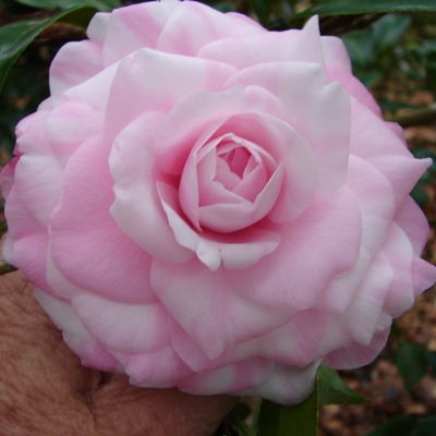 Light orchid pink. Large rose form double to formal double. Vigorous dense upright growth. Early to Mid season bloom.