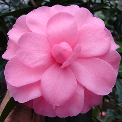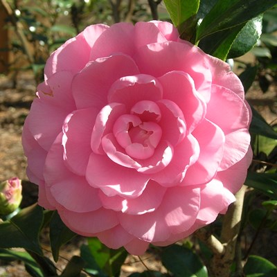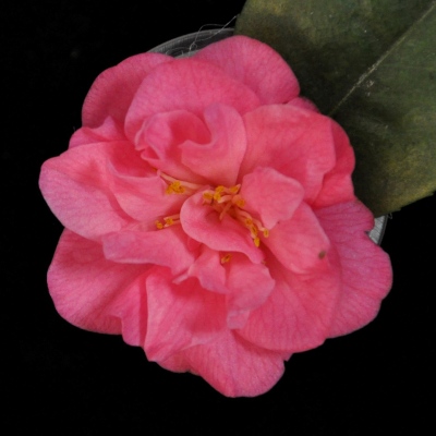 Rose pink outer petals shading to lighter pink at center. Small formal double with incurved petals. Vigorous growth. Mid season bloom.