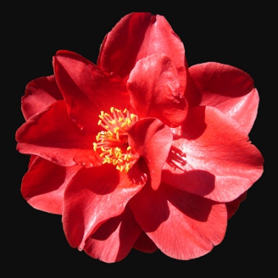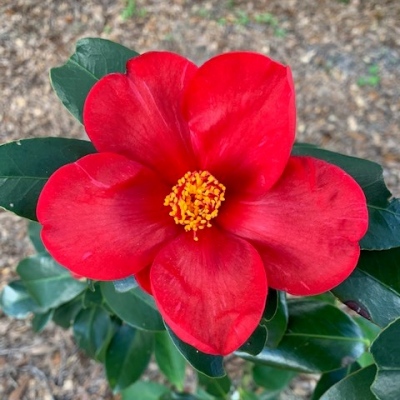 Glowing ruby red. Medium single form. Vigorous upright growth. Blooms twice yearly.
