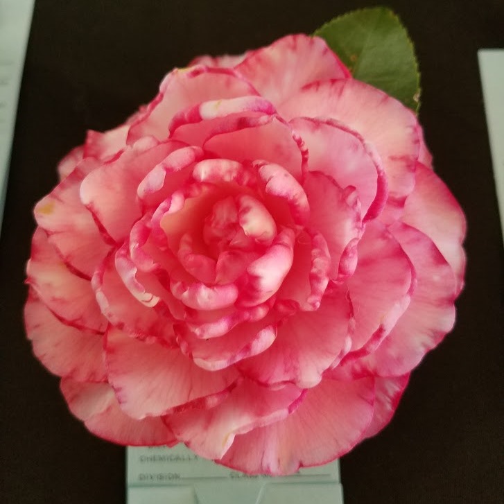 Black red variegated white. Large rose form double. Average compact upright growth. Mid to late season bloom.