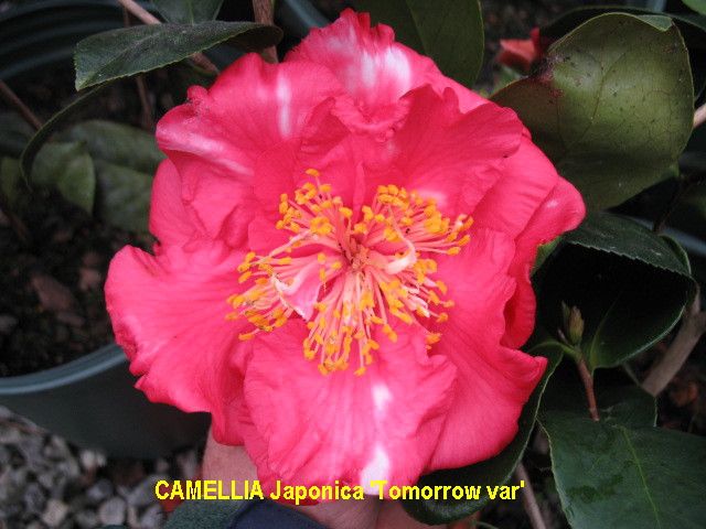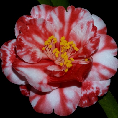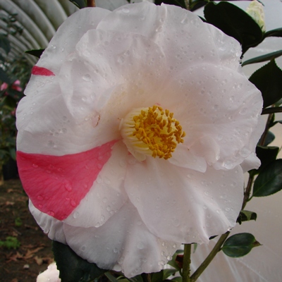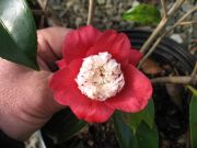 Sport of ‘Donckelarii’. Dark red blotched white. Medium to large semidouble sometimes with upright fimbriated petals. Mid to late season bloom.