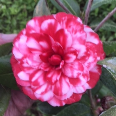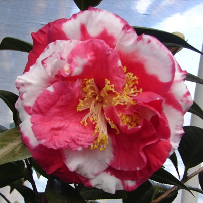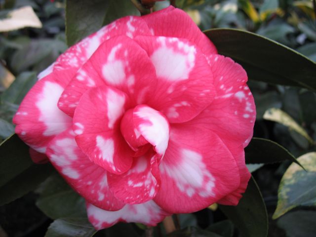 Dark red blotched white. Medium to large semidouble with irregular petals Average compact growth. Early to mid season bloom.