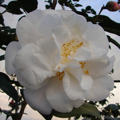White. Large semidouble with wavy petals. Vigorous bushy upright growth. Early to mid season bloom.