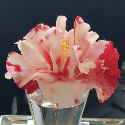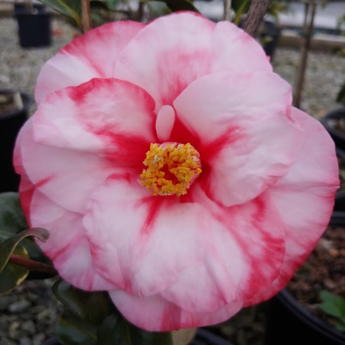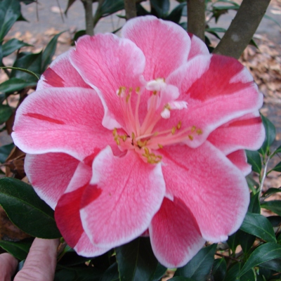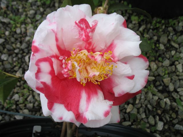Pink veined red with white margin. Small to medium semidouble. Average upright growth. Early to mid season bloom.