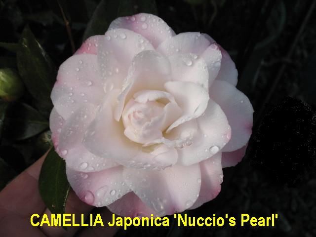 White with peach blush. Medium, formal double. Mid to late season.