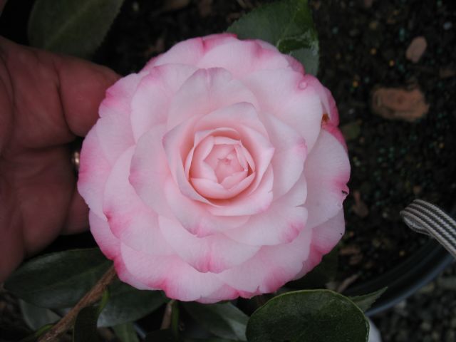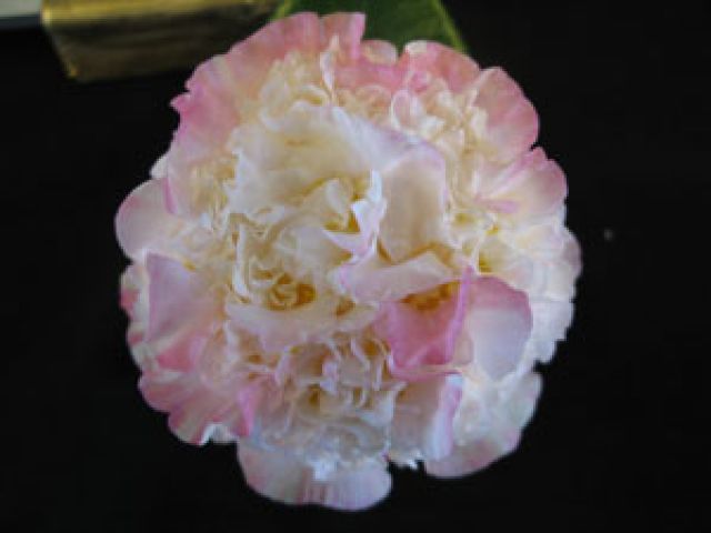 Pale pink edged burgundy red. Minature to small, formal double. Mid season bloom.