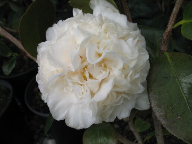 White. Large formal double. Vigorous upright growth. Late season bloom.