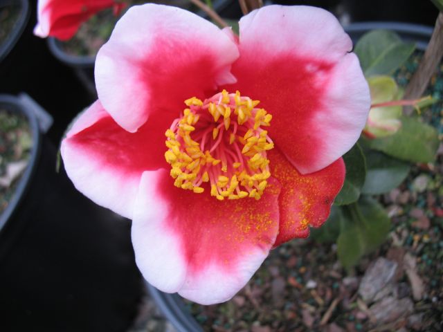 Red bordered white. Small to medium single. Vigorous upright growth. Mid season bloom.