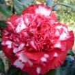 Predominantly white over dk red. Large semidouble Avg compact growth. Mid season bloom