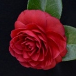 Very dark glossy red. Medium semidouble to rose form dbl. Avg spreading