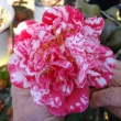 Deep red streaked white. Medium loose peony form with irregular petals.
