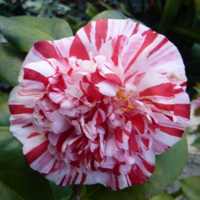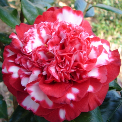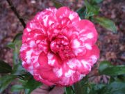 Ruby red variegated white. Large loose peony form. Average compact upright