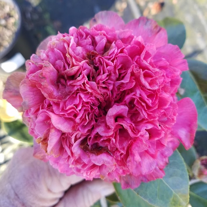 rose form double with highly ruffled petals. Vigorous, open, upright growth.